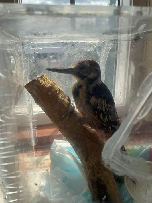 2025年、9月。本年の北海道は暑い夏でしたが、いまだ日中は暑いが続いています。道内でオスの成鳥のエゾアカゲラが保護され連絡がありました。 保護された市民の方が役所へ連絡し、環境省希少動植物保護員である当方のところに搬入されました。保護された原因は不明です。おそらく、状況から建物、窓等に激突したのではと思われました。 鳥は脱水し栄養状態は良くありませんでしたが、 幸い羽や脚には問題はなく、しばらく飼養した後、飛翔訓練をして 放鳥できそうだと判断しました。 そして、3週間ほどの飼養期間を要して放鳥することとなりました。 飼養期間の餌は、ミールワームや昆虫類などのたんぱく質食ですが、 初めはあまり食べず、補助給仕を人工えさで行いましたが 元気が出ると虫をねだるようになり、鑷子から直接食べるほどの 大食漢でした。一日にミールワームを300匹くらいは食べます。 餌の用意が毎日大変です・・・ 飼養する籠の中を攻撃的に突いて、あっという間に1cm厚の板を壊すので、脱走防止に壊れない厚いアクリルのケースを作製し、その中にビール瓶ほどの太さの木を立てかけると、上手にその木に垂直に止ります。暇があれば(暇でしょうね)いつもその木を突いてカンカンカンカンとリズミカルに大きな音を立てています。 放鳥の条件は、エサのある場所、天候状況、外敵がいないこと、鳥の種類により時間や環境を選ぶ必要があります。 今回の選定は、山林であること、カラスが来ないこと、天気が良い午前中と決めました。エゾアカゲラは留鳥で冬でも渡りはしません。 場所を羊蹄山の麓と場所を決め、かねてから視察し決めていたカラスやキツネの来ないカラマツやナラノキのある林にて放鳥を行いました。